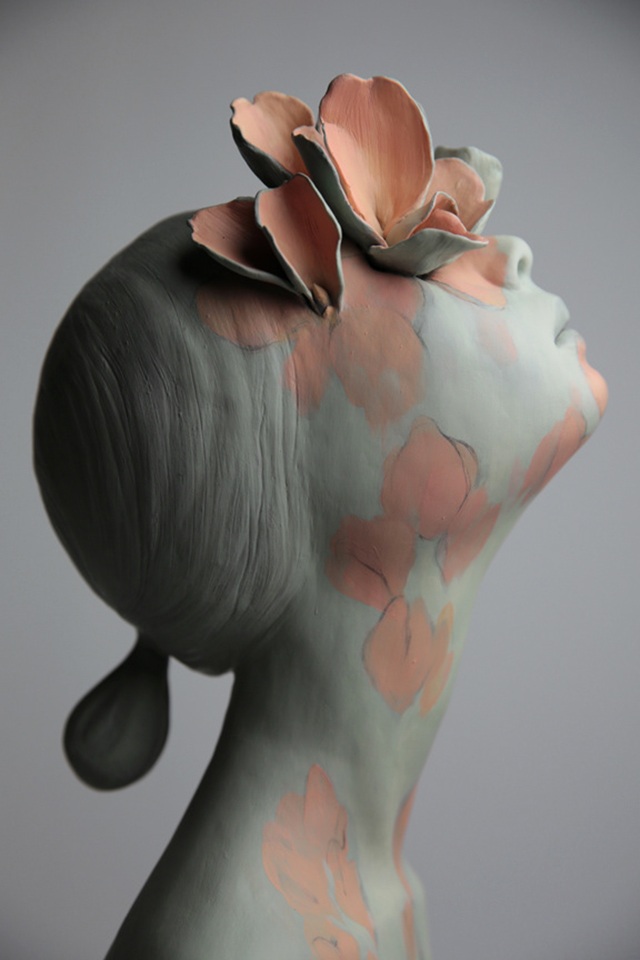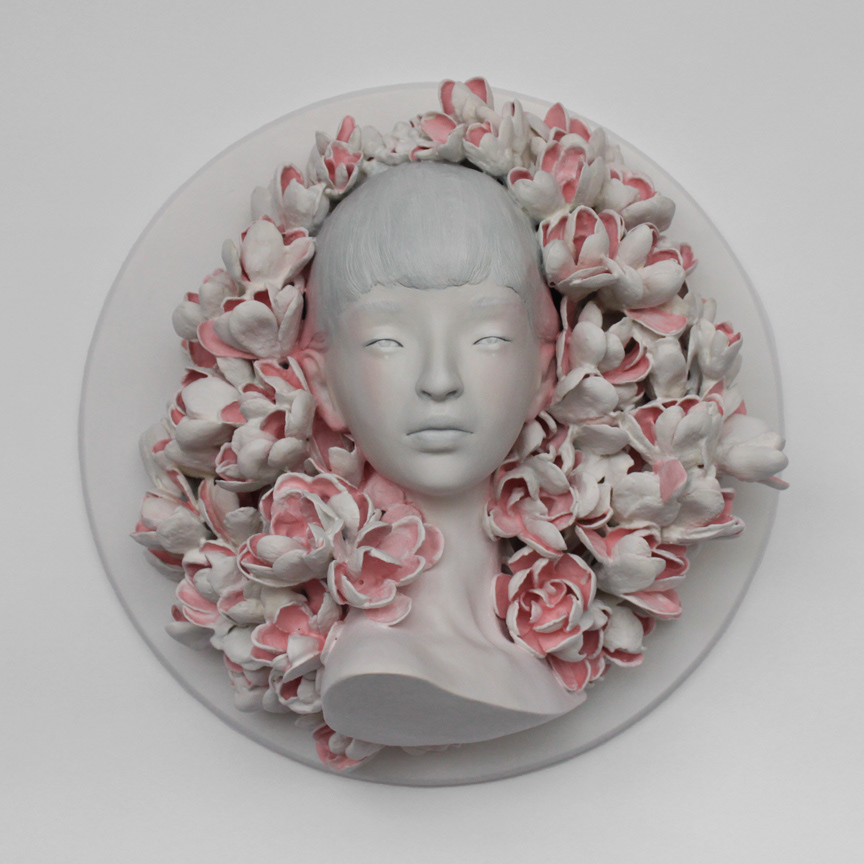 Gosia is an artist with a lot of churning in her soul. Her art is rooted in a need to process the world, society and life’s experiences. Her creative process strives to filter out the dark, scary and ugly in search of innocence, beauty and spirituality. She uses figures to poetically personify her emotions. At first glance these figures appear still, but their gentle expressions, graceful gestures and haunting gazes reveal a quiet storm of inner contemplation. She uses various visual symbols, often inspired by nature, to further reveal their inner turmoil. Their striking and resonating quality lies in capturing feelings normally expressed in private, yet she freezes them and allows us to take as long and as close of a look as we want. Inanimate objects become intimate as we see ourselves in them.
